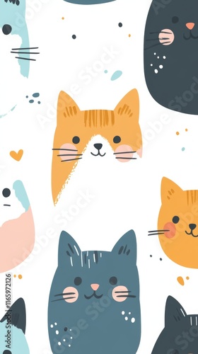 cute, cartoon, cat, pattern, design, vector, illustration, graphic, art, digital artwork, whimsical, playful, cheerful, colourful, children, children, baby, childcare center, home decor, textile, fabric, wallpaper, wrapping paper, cardboard box, branding, merchandise, graphic design