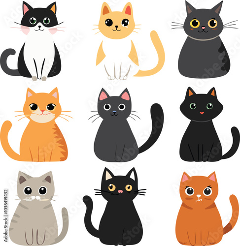cat, cartoon, cute, adorable, pet, animal, kitten, felino, illustration, drawing, design, graphic, art, style, anime, manga, character, collection, set, variety, fur, colours, pattern, black, white, brown, orange, yellow, grey, sitting, position, pose, eye, expression, happy, smiling, whimsical, playful, friendly, sweet, love, affection, companion, domestic