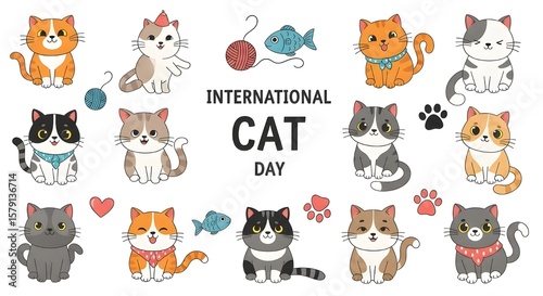 Cute Cartoon Cats International Cat Day Vector Illustration for Kids and Pet Lovers