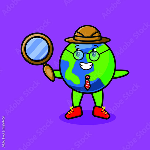 Cute cartoon character Earth detective is searching with magnifying glass and cute style design for t-shirt, sticker, logo element