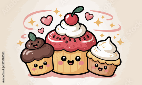 Cute cartoon cupcakes with happy faces, decorated with frosting and fruit, displayed against a light background.