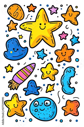 cartoon, doodle, star, planet, space, spaceship, happy, cute, illustration, design, character, whimsical, galaxy, celestial, cosmic, fun, colourful, children, children, art, drawing, vector, clip, graphic, pattern, childish, bright, cheerful, adorable, sweet, imaginative, fantasy, sky, universe, outer