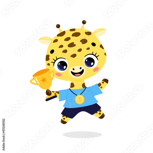 Cute cartoon flat doodle animals sport winners with gold medal and cup. Giraffe sport winner