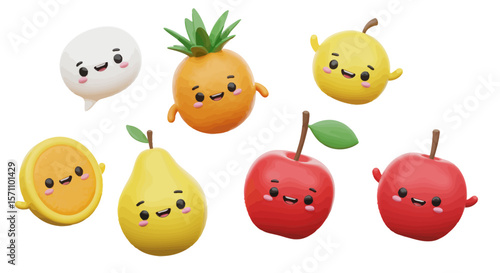 fruit, cartoon, cute, pineapple, apple, pear, orange, lemon, smile, face, character, food, sweet, healthy, fresh, vitamin, illustration, design, graphic, cheerful, happy, adorable, fun, playful, vibrant, bright, colourful, isolated, white, background, rendering, three-dimensional, digital, art, drawing, clip, studio, nobody, object, element, decoration, decorative, icon, symbol, shape, round, circle, oval