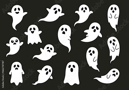 Cute Cartoon Ghosts Collection with Fun Expressions on Dark Background"