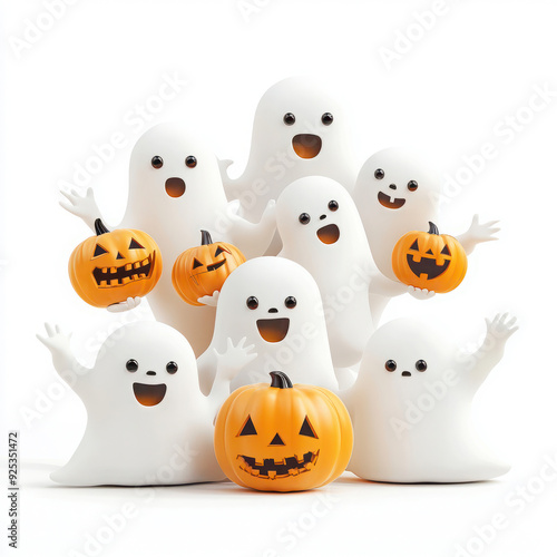 Cute cartoon ghosts holding jack-o'-lanterns, celebrating Halloween with cheerful expressions, isolated on white background