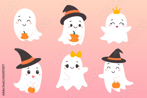 Cute Cartoon Ghosts with Pumpkins and Halloween Accessories on Pink Background for Festive Holiday Decorations and Seasonal Greeting Cards in a Playful and Spooky Style