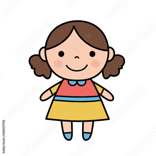 Cute cartoon girl doll with pigtails and colorful dress, hand-drawn illustration, no background