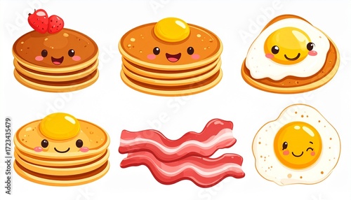 Cute cartoon pancakes, eggs, and bacon, perfect for breakfast illustrations.
