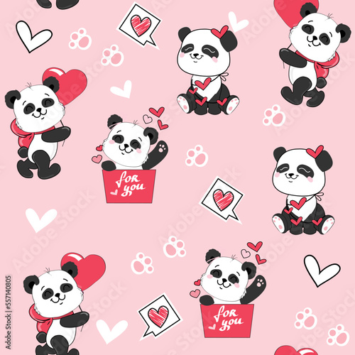 Cute cartoon panda with hearts on a pink background seamless pattern. Vector cartoon illustration in kawaii style. Valentines day and Birthday concept
