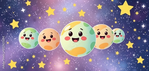 Cute cartoon planets with smiling faces float amidst twinkling stars, night sky, illustration