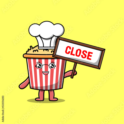 Cute cartoon Popcorn chef character holding close sign board designs in flat cartoon style