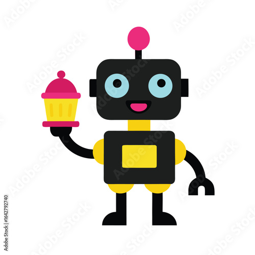 robot, cute, cartoon, character, illustration, technology, futuristic, machine, artificial intelligence, friendly, happy, holding, cupcake, sweet, treat, dessert, food, celebration, toy, children, children, simple, vector, graphic, digital artwork, white background, isolated, fun, playful, joy, mechanical