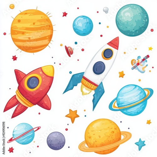 Cute cartoon space objects, rocket, planets, stars, astronaut, clipart, white background, high quality--ar 1:1
