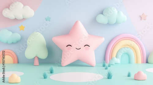 Cute Cartoon Star in Pastel Candyland Scene Happy Rainbow Clouds Trees