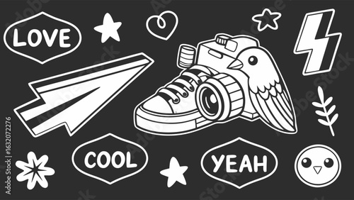 cartoon, sticker, camera, bird, sneaker, love, cool, yeah, star, nubes, graphic, design, cute, fun, whimsical, black, white, illustration, art, graphic design, element, collection, retro, pop art, vintage, design element, vector, modern, trendy, aesthetic, simple, outline