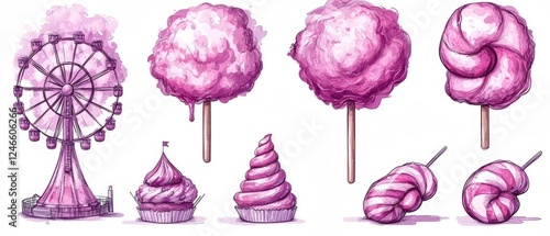 cute, cartoon, vector, style, carnival, illustration, set, cotton, candy, ferris, wheel, dessert, sweet, fluffy, pink, fun, festival, treat, festive, playful, whimsical, food, amusement, fair, joy, celebration, attraction, spin, spiral, swirl, pop, stick, cone, party, vibrant, exciting, cheerful, children, joyful, entertainment, colourful, graphic, design, art