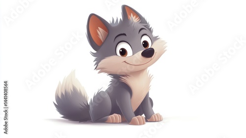 Cute cartoon wolf, sitting, white background, children's book illustration, digital art, friendly animal, possible use in kids' media