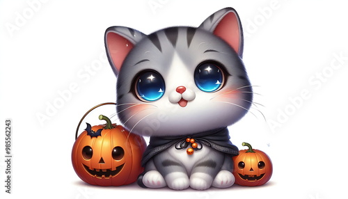 Cute Cat with Pumpkins , Halloween , Animation Style, Happy and Beautiful, Design for T-Shirts, Stickers, or Any Product, White Background, AI-Generated