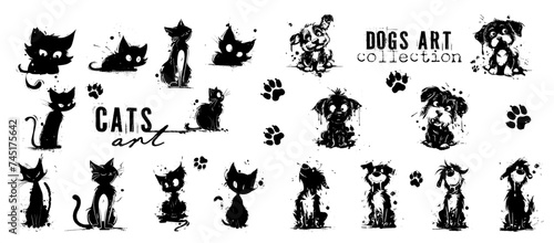 Cute cats art in different poses. Pets silhouettes, various kittens and tomcats, shown sitting and lying down. Vector collection of drawn cats with lots of details and artistic spots.