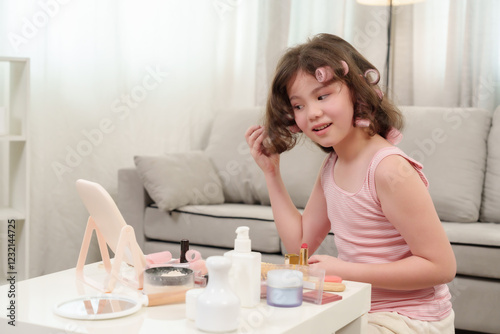 Cute Caucasian girl who loves beauty sitting in living room wearing pink striped tank top with pink hair rollers smiling while styling curly hair using finger beauty products makeup tools mirror table