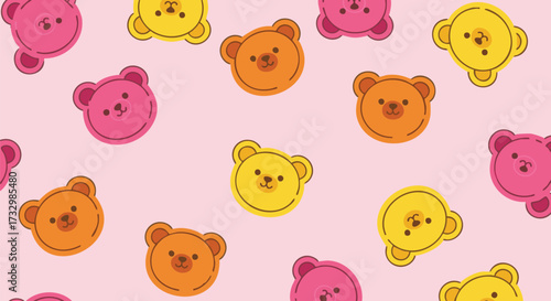 Cute, cheerful seamless pattern with cartoon bear faces in yellow, orange, and magenta on a pink background