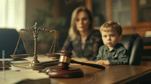 Cute child and mother at table with gavel of judge blurred in background, family law concept