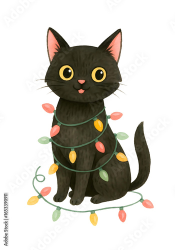 Cute Christmas Cat Watercolor Clipart – Holiday Kitten with Santa Hat and Fairy Lights Illustration, Winter