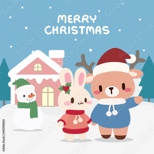 Cute Christmas Scene with Reindeer, Bunny, and Snowman. Adorable Holiday Illustration. Reindeer and Bunny Celebrating Christmas.Kawaii Christmas Artwork with Winter Friends and Festive Cheer.