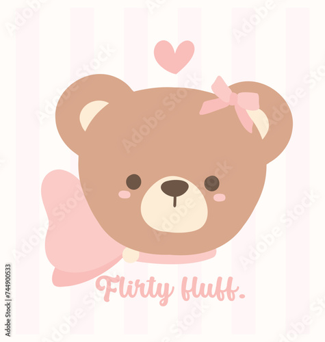 Cute Coquette Teddy Bear face with Pink Ribbon Bow, Adorable Illustration