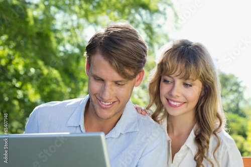 young adult, man, male, caucasian, woman, female, park, countryside, nature, parkland, green, grass, sun, sunshine, bright, casual attire, photogenic, pretty, attractive, fashionable, fashion, stylish, style, shirt, sitting, bench, love, affection, relaxing, content, couple, human relationships, together, happy, smiling, cheerful, touching, shoulder, looking, watching, laptop, notebook, technology, computer, wireless