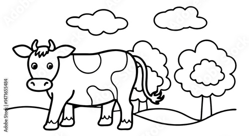 Cute cow standing in a grassy field with a milk pail, under a cloudy sky. coloring book