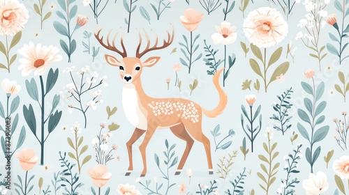 Cute deer standing in a floral meadow.