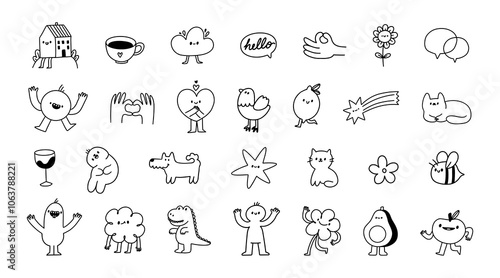 character, vignetting, little, tattoo, children, line, children, character, hand-drawn, doodle, cute, black, house, sticker, vector, set, hot drink, hallo, dinosaur, food, speech, cloud, drink, flower, whimsical, bee, fruit, playful, bubble, icon, object, positive, happy, joy, bird, cat, dog, love, nubes, animal, plant, funny, print, branding, star, wine, greeting, collection