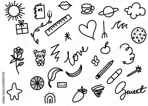 Cute doodle for child, hand drawn set of cute doodles for decoration on white background, Funny Doodle Hand, Coloring Page, school, college, sketches