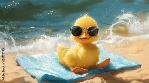 Cute Duckling Relaxing by the Beach with Sunglasses