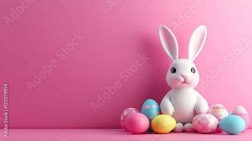 Cute Easter bunny, surrounded by chocolate eggs, pastel background, 3D illustration