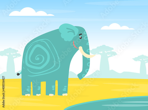 Cute Elephant African Animal on Background of African Savanna Landscape Cartoon Vector Illustration