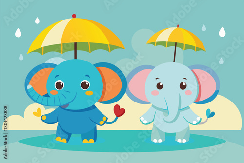 Cute elephants with umbrellas enjoying a playful moment in the rain during a vibrant and cheerful afternoon in a whimsical illustrated environment