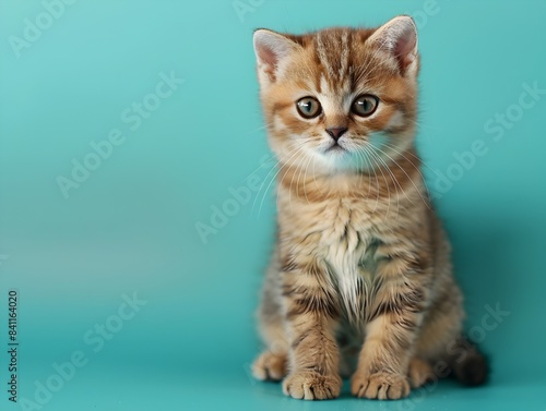 Cute Exotic Shorthair Kitten Sitting on Mint Blue Background