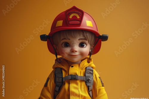 cute, firefighter, boy, cartoon, three-dimensional, render, helmet, yellow, red, orange, background, illustration, character, children, safety, brave, hero, profession, fire, rescue, emergency, service, equipment, gear, portrait, animation, digital artwork, artwork, graphic, design, image, concept, art, creative, fun, playful, happy, smile, look, eye, brown, hair, face, expression, friendly, adorable, realistic, model