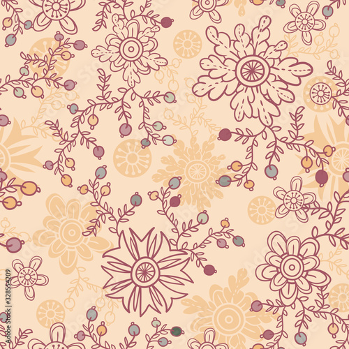 Cute floral seamless pattern. Vector background with flowers and leaves.