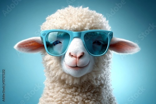 sheep, fluffy, cute, white, sunglasses, blue, funny, animal, wool, calm, expression, gradient, goggles, studio, no people, nobody, face, portrait, humor, light, soft, fur, style, playful, pet, nature, whimsical, charming, lovable, character, adorable, day, scene, background, personality, bright, clear, fashion, accessory, fun, cheerful, vibrant, interactive, creative, artistic, ai, generative