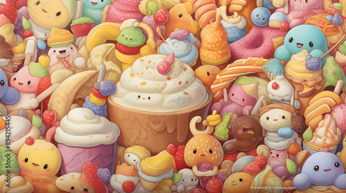 cherry, whimsical, candy, fun, sprinkle, sweet, art, bakery, digital artwork, frosting, pudding, pastry, banana, colourful, milkshake, strawberry, fruit, illustration, dessert, happy, snack, cute, cartoon, character, smile, cupcake, adorable, ice cream, food, donut