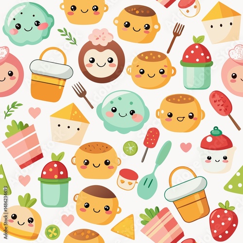 food, pattern, cute, face, smiley, fruit, vegetable, bread, cheese, dessert, drink, sweet, lunch, picnic, adorable, happy, summer, design, colourful, background, repeat, illustration, vector, simple, graphic, delicious, breakfast, dinner, snack, party, children, children, fun, whimsical, bright, pastel