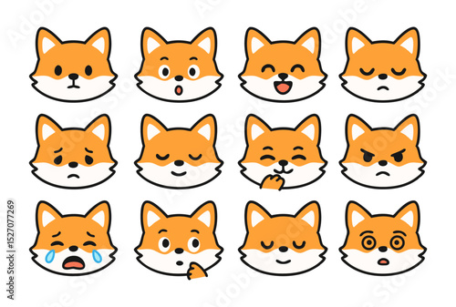 Cute Fox Emoji Faces Set – Kawaii Animal Expressions in Flat Vector Style for Stickers, Emotes and Reactions