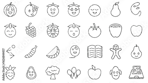 Cute Fruit and Food Character Outline Icons Set – Smiling Apple, Pear, Banana, Grapes, Melon, Coconut, and Veggie Faces for Kids Menu, Fun Learning, Nutrition Apps, Stickers, and UI Design Projects