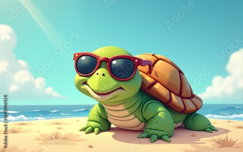cute funny cartoon turtle on the beach wearing sunglasses design. High quality