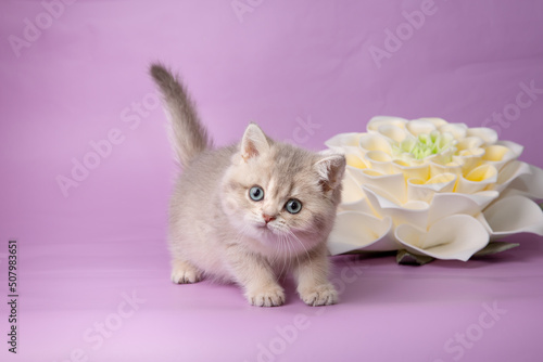 cute, funny little kitten with a flower on a purple background