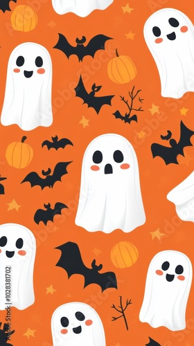 cute, ghost, halloween, seamless, pattern, v, job, id, vector, october, cartoon, illustration, design, pumpkin, holiday, horror, skittish, wallpaper, decoration, celebration, orange, black, bat, scarey, fun, happy, texture, night, trick, party, graphic, paper, spider, fear, skull, treat, symbol, fall, silhouette, evil, smile, funny, print, hat, web, boo, childish, sorcerer